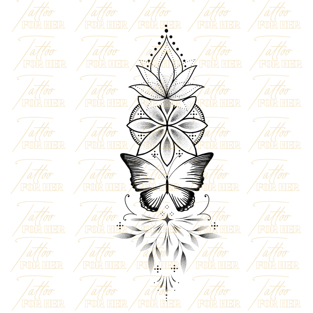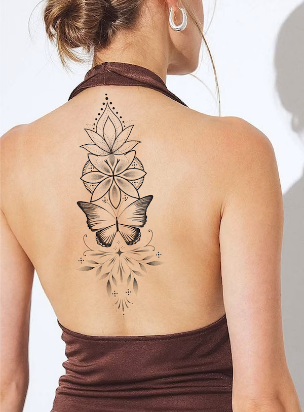This fine line vertical tattoo design combines sacred lotus symmetry with a graceful butterfly centerpiece, creating a balanced and feminine spine composition. The structured geometry, subtle dotwork shading, and airy negative space make this design ideal for elegant back placement.